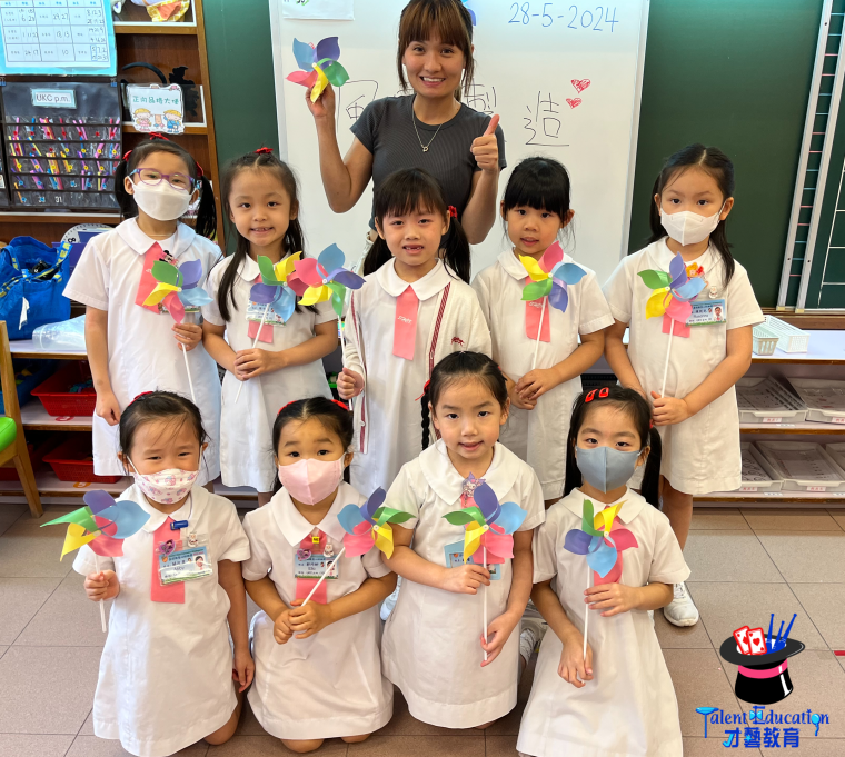 學生先創作屬於自己的風箏,填上顏色及畫上自己喜愛的圖案,再以木棍/竹棍貼在風箏上固定位置,最後將線穿過風箏並加上彩帶作裝飾。
