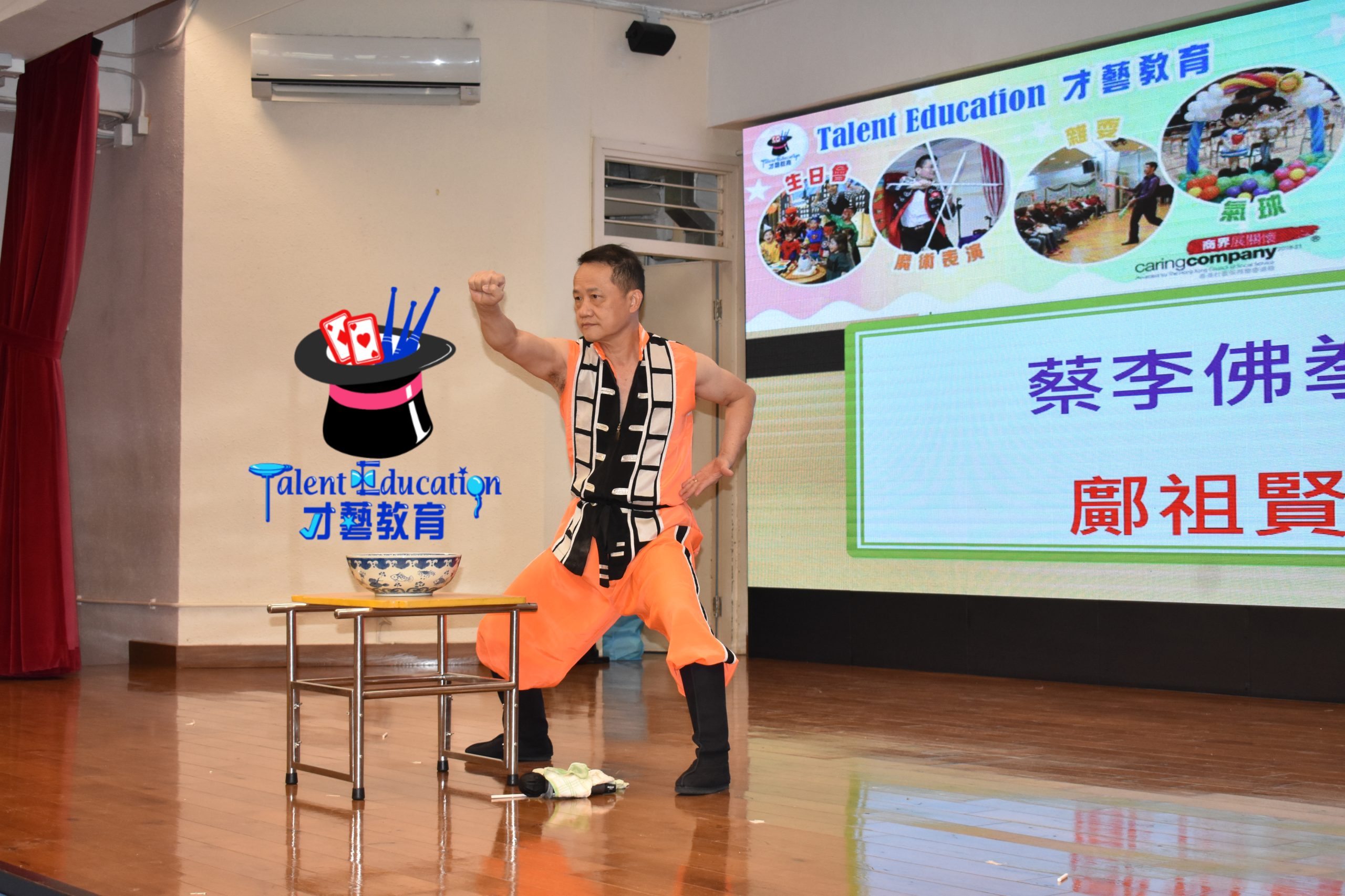 蔡李佛拳表演包括: 筷子穿木板、爆鐵鏈、拳術、氣功吸大碗、踩刀、輕功紙上飄等